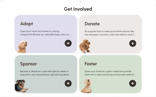 - The "Get Involved" section employs popup cards for "Adopt," "Donate," "Sponsor," and "Foster" to provide concise, preliminary information without navigating away from the landing page. This design choice prioritizes simplicity and user convenience, ensuring essential information is readily accessible.