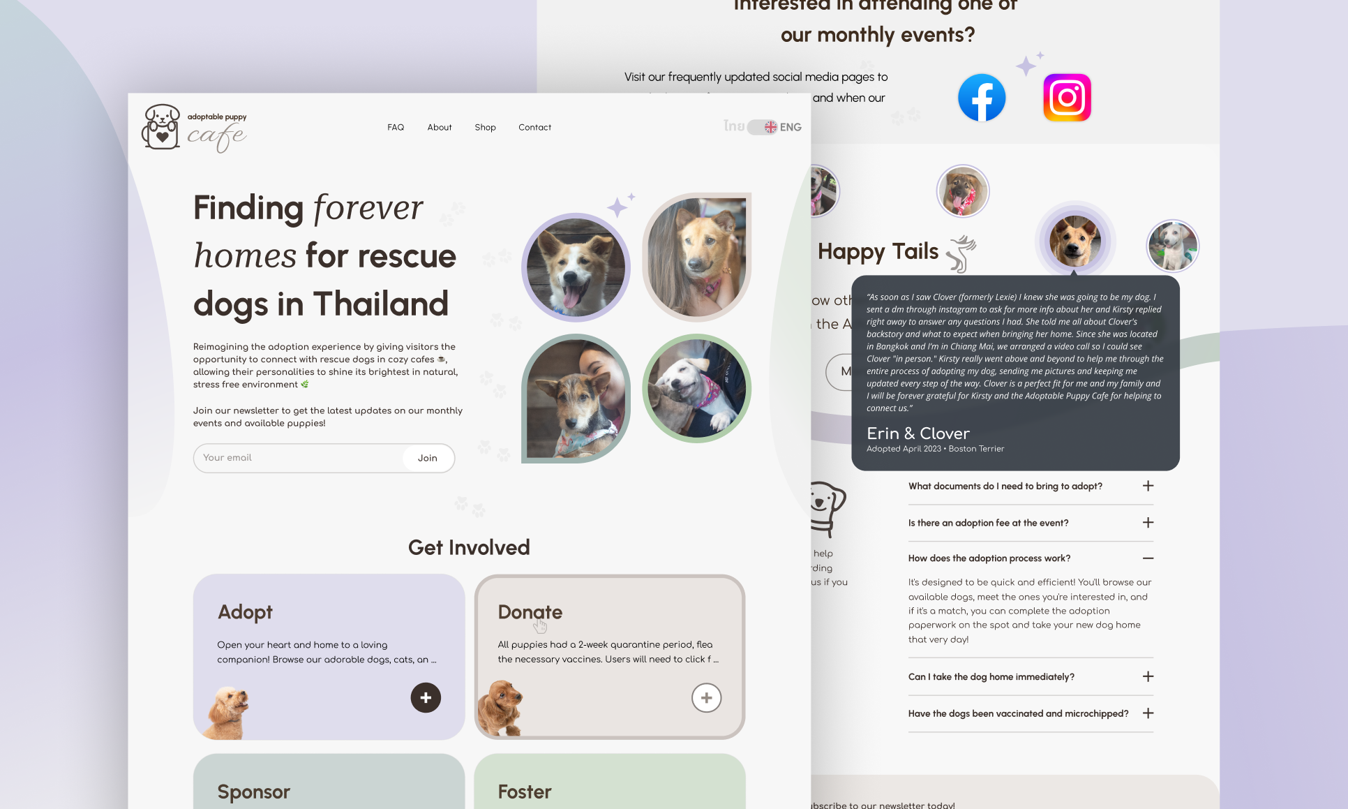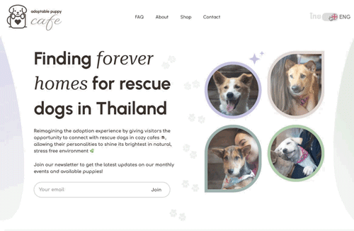 Driven by a design challenge from Sand Studio & Co. to create a website for an animal adoption initiative, I volunteered to design a user-friendly landing page for the Adoptable Puppy Cafe (APC). APC is an initiative that works alongside rescue groups to hosts monthly meet-and-greet events, connecting rescue dogs with potential adopters. This project aimed to bridge the gap between APC's successful offline events and their online presence, ultimately creating a clear online pathway for potential adopters.