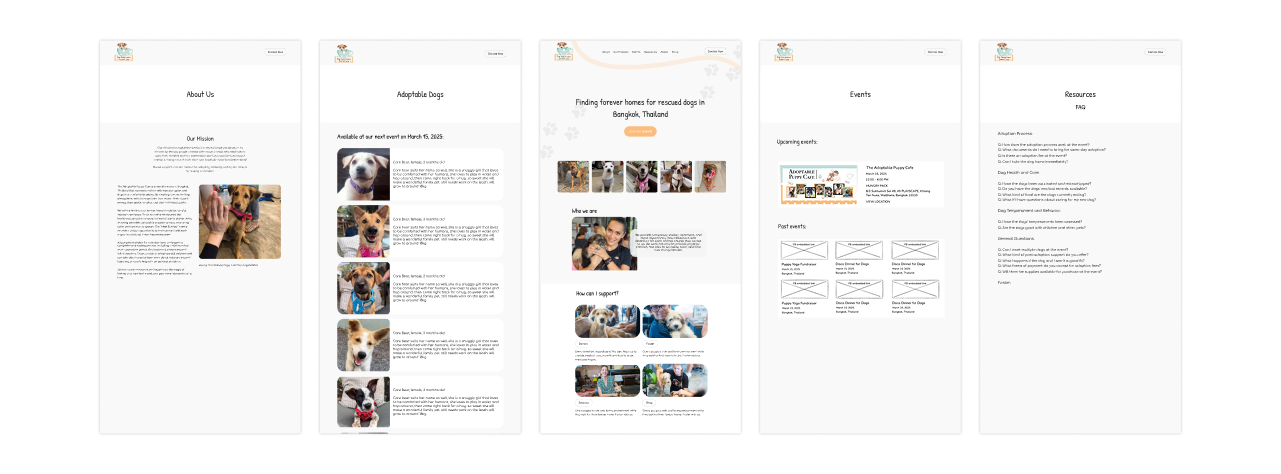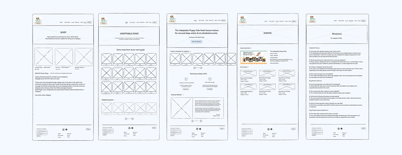 To facilitate a productive discussion with APC's founders about my volunteer design services, I translated preliminary research into wireframes and a low-fidelity prototype. The wireframes were structured to optimize user flow, highlighting key features such as event information, puppy profiles, and a comprehensive FAQ. The prototype then provided a visual representation of this flow, showcasing site navigation and information accessibility.